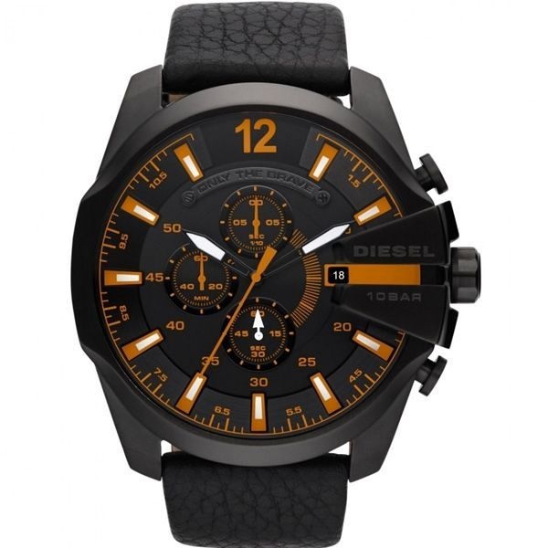 Com design moderno e arrojado, o relógio masculino estilo diesel tem pulseira de couro, analógico e com visor de vidro, mostrador pretos, detalhes em laranja, um toque que o deixa ainda mais bonito.